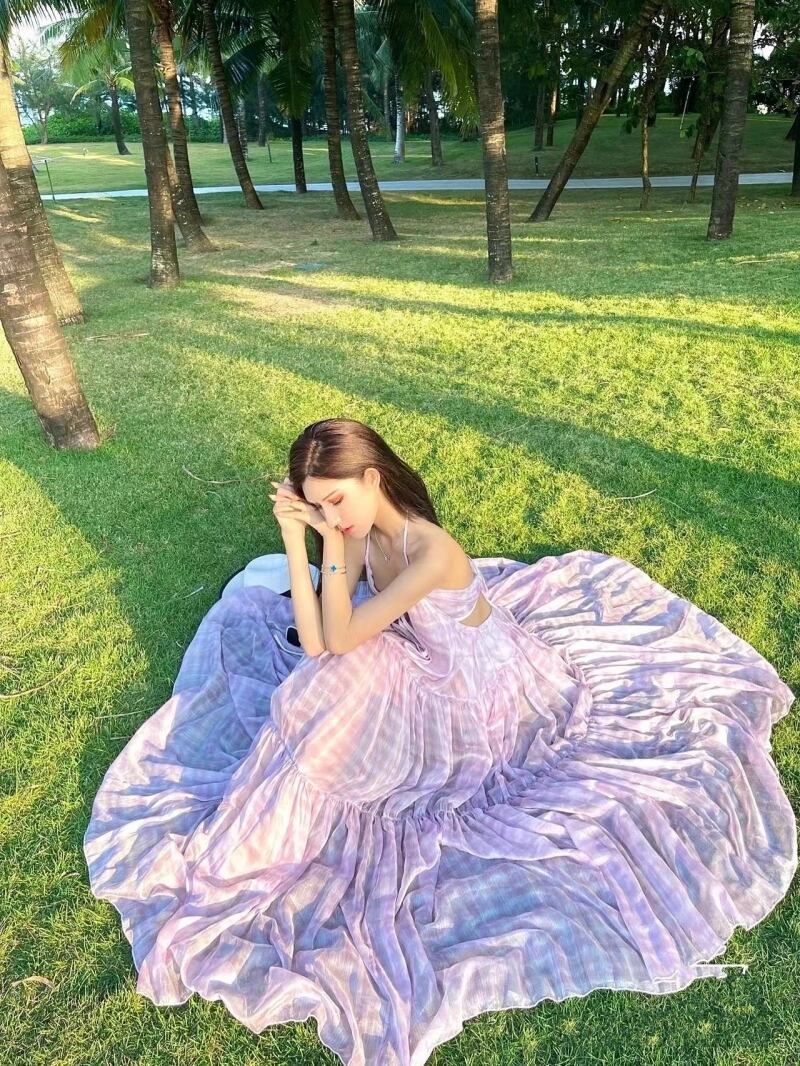 リゾートにぴったりなサマードレス 大きく背中の開いたセクシーなデザイン 薄くて軽いラベンダーシフォンワンピース。