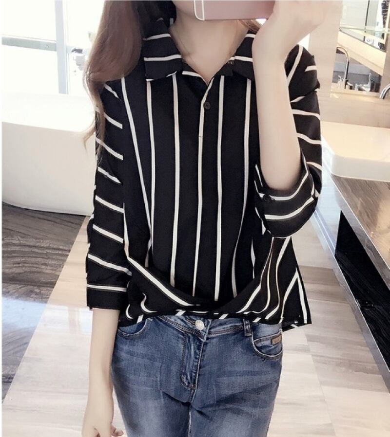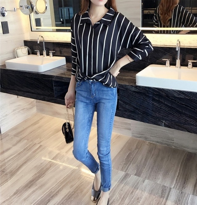 Vネックシフォンシャツ、ストライプ柄でクールな印象になります。