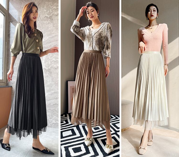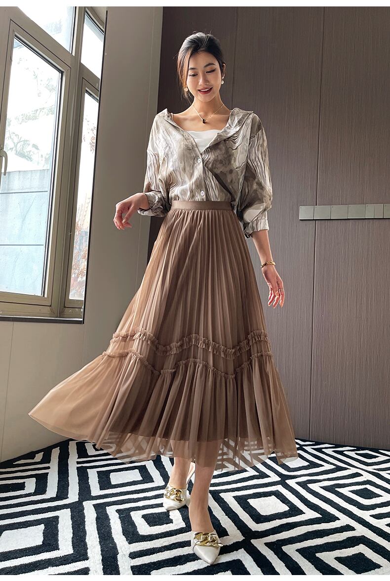 透け感のあるシフォン生地と刺繍レースをあしらったデザインが特徴的です。清涼感のあるホワイトやブラウン、使い勝手が良いブラックの3色展開で、春夏秋のコーディネートに取り入れやすくなっています。