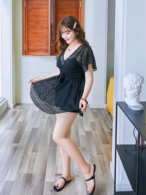水着 ワンピース水着 体系カバー水着 ワンピース パッド付き 半袖 レース かわいい 大人可愛い カジュアル 大人っぽい おしゃれ ガーリー 柄 レディース 女性用 夏 海 ビーチ プール リゾート 体系カバー 大きめ ぽっちゃり 黒 ブラック