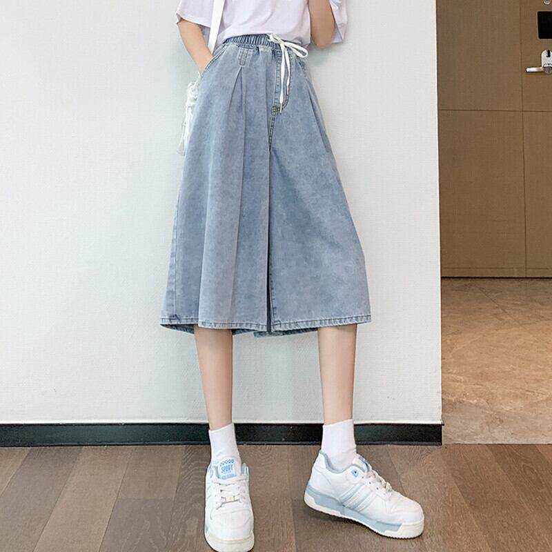 デニムパンツ ワイド ハーフ ハイウエスト 伸縮性 ひざ丈 ウエスト紐 ライトブルー ボトムス ズボン ワイドパンツ 膝丈 ウエストゴム デニム かわいい きれいめ シンプル カジュアル レトロ こなれ感 ラフ メンズライク ボーイッシュ スポーティー ラブリー キュート ガーリー ルーズ 個性的 主役級 存在感 無地 春 夏 秋 10代 20代 レディース 男女兼用 通学 デート お出かけ アウトドア 旅行 海 プール 着回し 普段使い 美脚 脚長