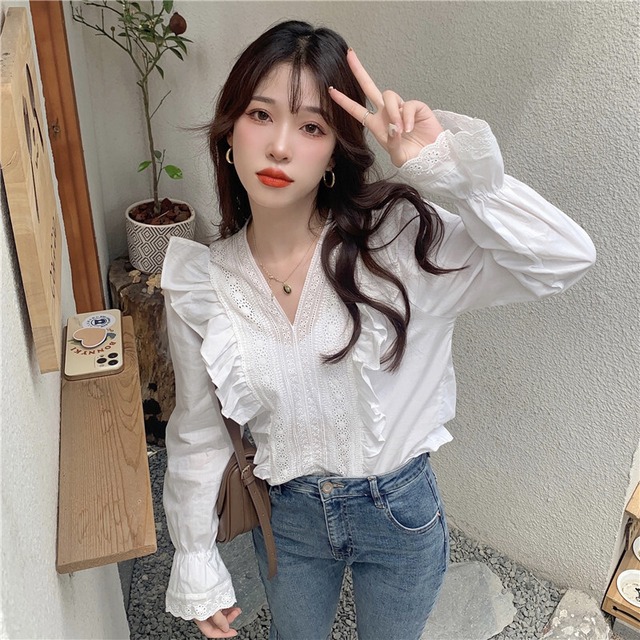 トップス プルオーバー 刺繍 フリル パフスリーブ ホルンスリーブ 長袖 ボリューム袖 袖あり Vネック 襟なし かわいい 大人可愛い きれいめ シンプル 上品 おしゃれ お洒落 レトロ ラフ ラブリー キュート ガーリー 個性的 エレガント モダン 主役級 存在感 柄 春 夏 秋 10代 20代 30代 40代 50代 60代 レディース 女性用 通勤 デート お出かけ パーティー イベント リゾート 旅行 ホテル レストラン 普段使い L XL 2XL 3XL 4XL 白 ホワイト