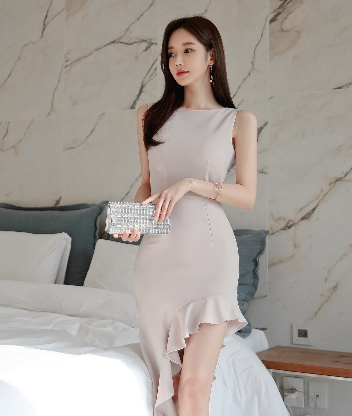 肌なじみのよい清潔感のあるカラーとデザイン性の高さが大人の女性に似合うドレスです。