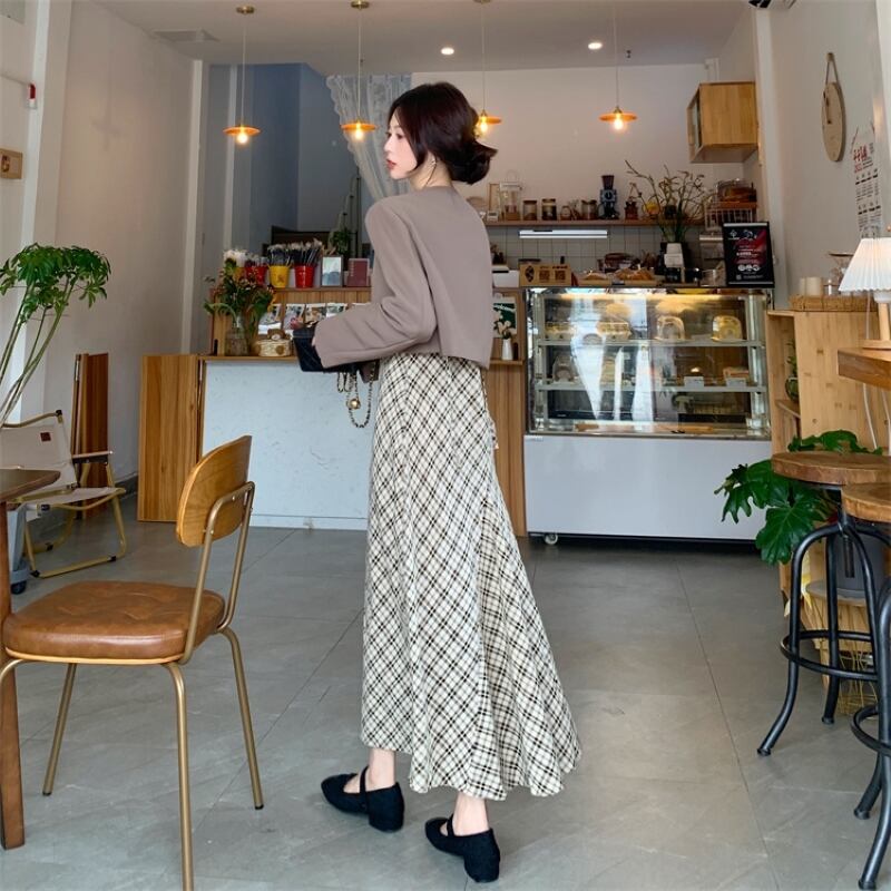 シックな色合いのショートジャケットとタータンチェックのワンピースのセットです。
