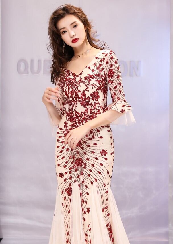 ワンピドレス ワンピース ロング マーメイド 7分袖 ベルスリーブ Vネック ハイウエス 刺繍 スパンコール シフォン フリル ファスナー ロング丈 袖あり 五分袖 襟なし 異素材MIX きれいめ 大人 上品 おしゃれ かっこいい エスニック エキゾチック 個性的 クール モード系 セクシー エレガント 主役級 存在感 柄 花柄 オールシーズン 謝恩会 結婚式 二次会 披露宴 レディース 女性用 パーティー イベント ホテル レストラン 美脚 S M L XL 黒 ブラック 赤 レッド アプリコット