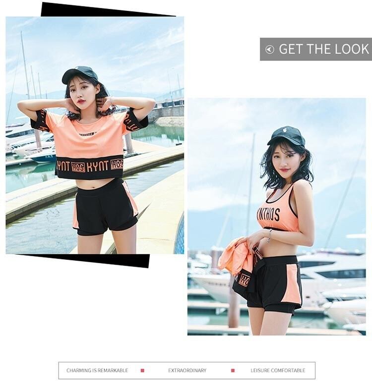 鮮やかなカラー展開で盛り上がる水辺スタイル!水着セットです。ミニ丈のショートパンツに、袖付きのトップス、さらにはインナーキャミソールまで揃った完璧な3点セット。Uネックが女性らしいデコルテラインを美しく際立てます。程よくゆとりのあるサイズ感で、快適に着用していただけます。