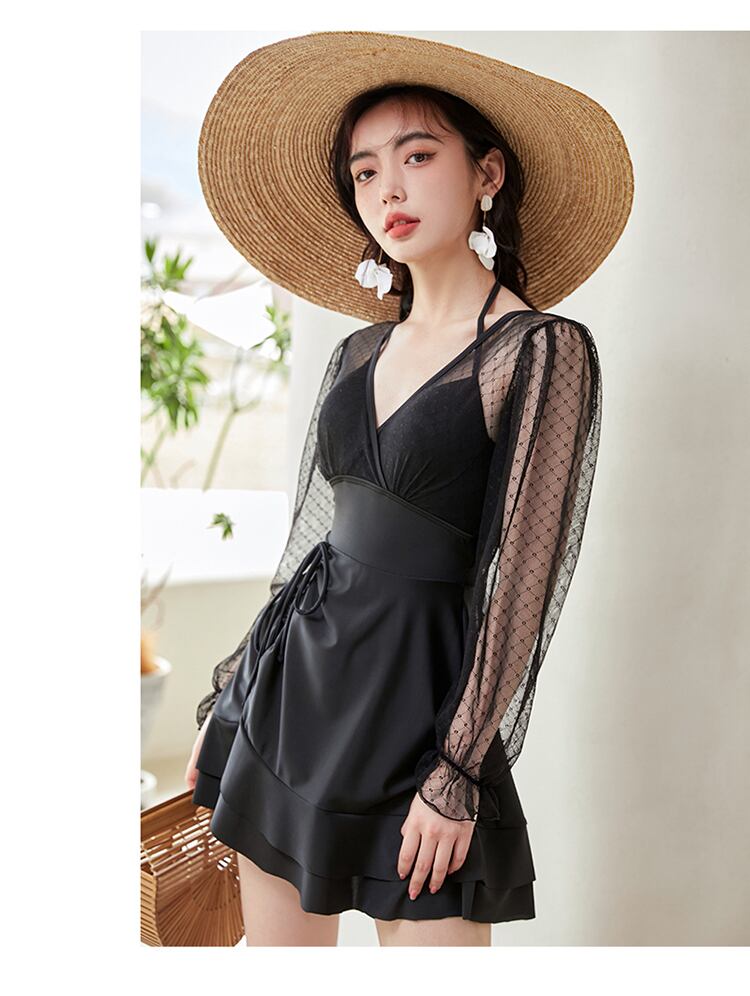 ウエストマークと長袖シフォンで体型カバーもできるワンピース水着です。