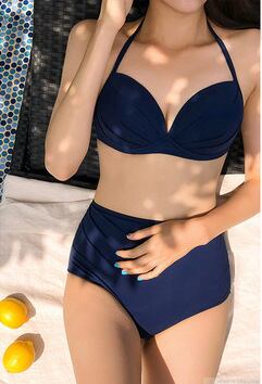 無地のビキニで、シンプルでナチュラルなスタイルを演出。やや高めのハイウエストタイプで、脚長効果もバッチリ。胸元をキュッと引き締めるフロントリボン、谷間を盛り上げるパッド入りで、美乳ラインにもこだわりました。