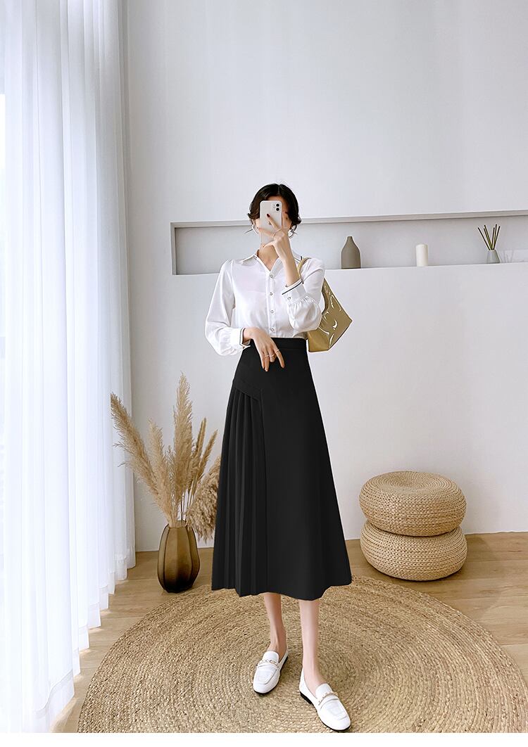上品で可愛く、どんな場面でも着こなしやすいロングスカートプリーツとアシンメトリーの組み合わせが、抜け感を演出し、大人らしい雰囲気も加味されています。フレアシルエットで脚長効果も抜群。