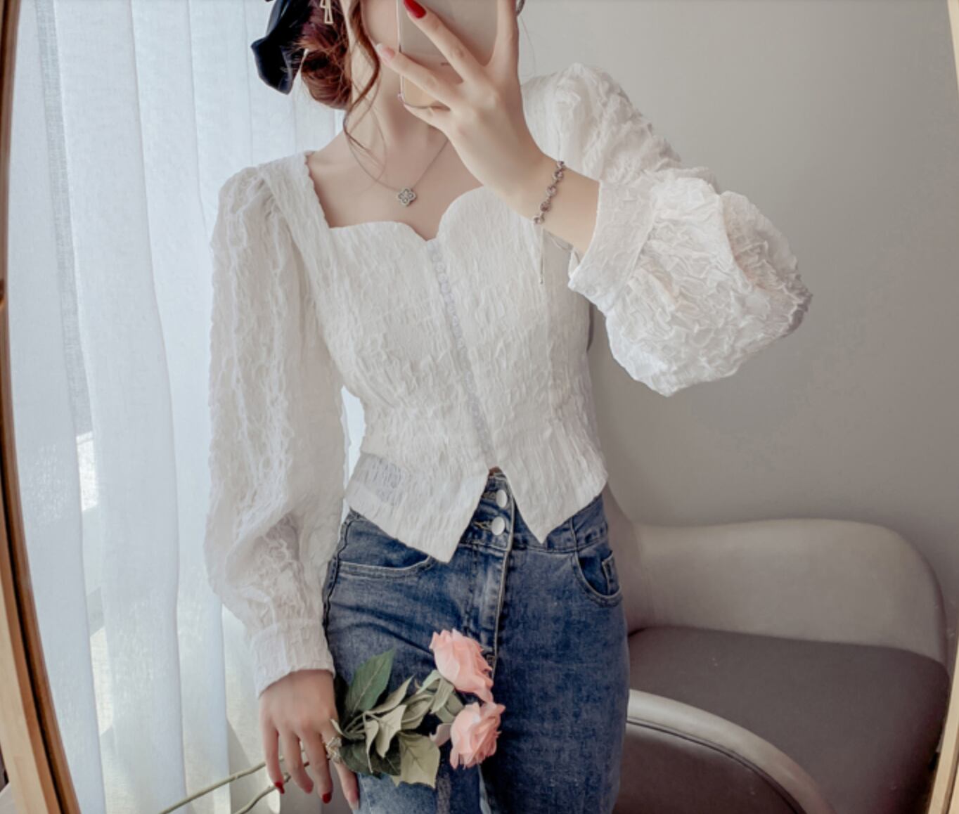 ふんわりとしたパフスリーブが可愛いブラウスです。