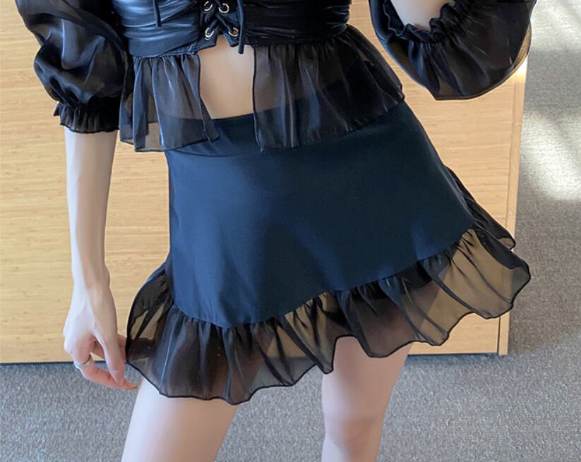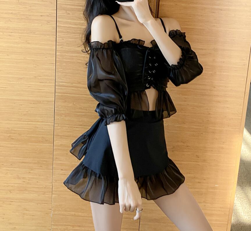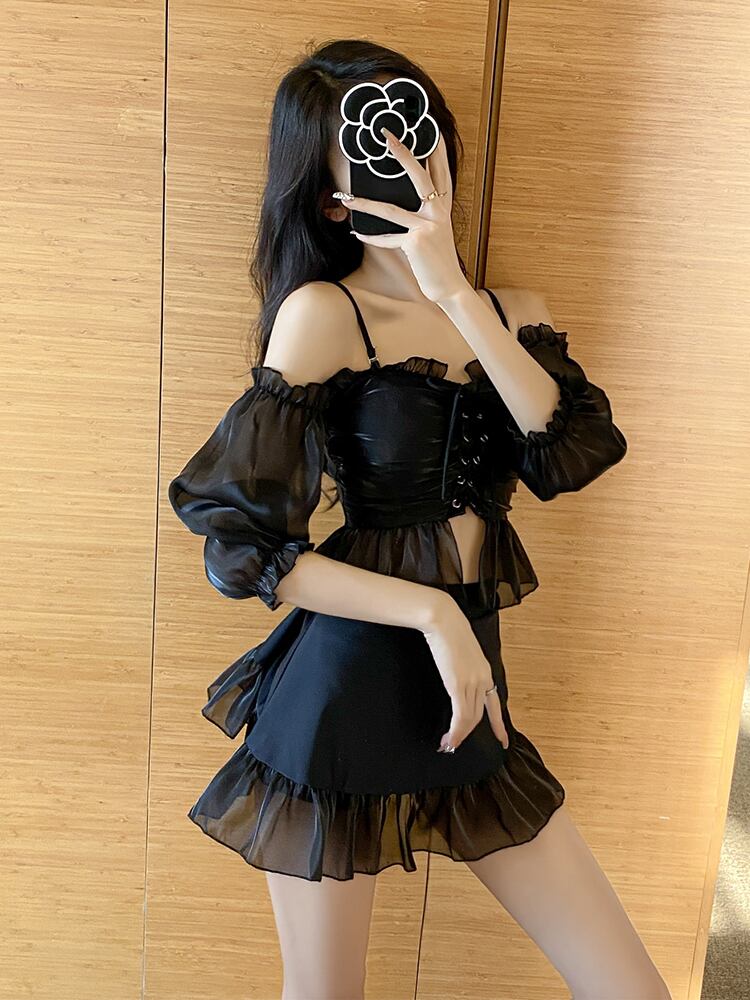 水着 スイムウェア ミニ ミニ丈 ショート ショート丈 袖あり 半袖 オフショルダー オフショル フレア チュール かわいい 大人可愛い 大人 上品 おしゃれ お洒落 レトロ 大人可愛い 大人女子 キュート ガーリー 無地 夏 10代 20代 OL 学生 デート お出かけ 休日 リゾート 旅行 海 プール 韓国 韓国系 オルチャン モテ サイズ M L XL ブラック