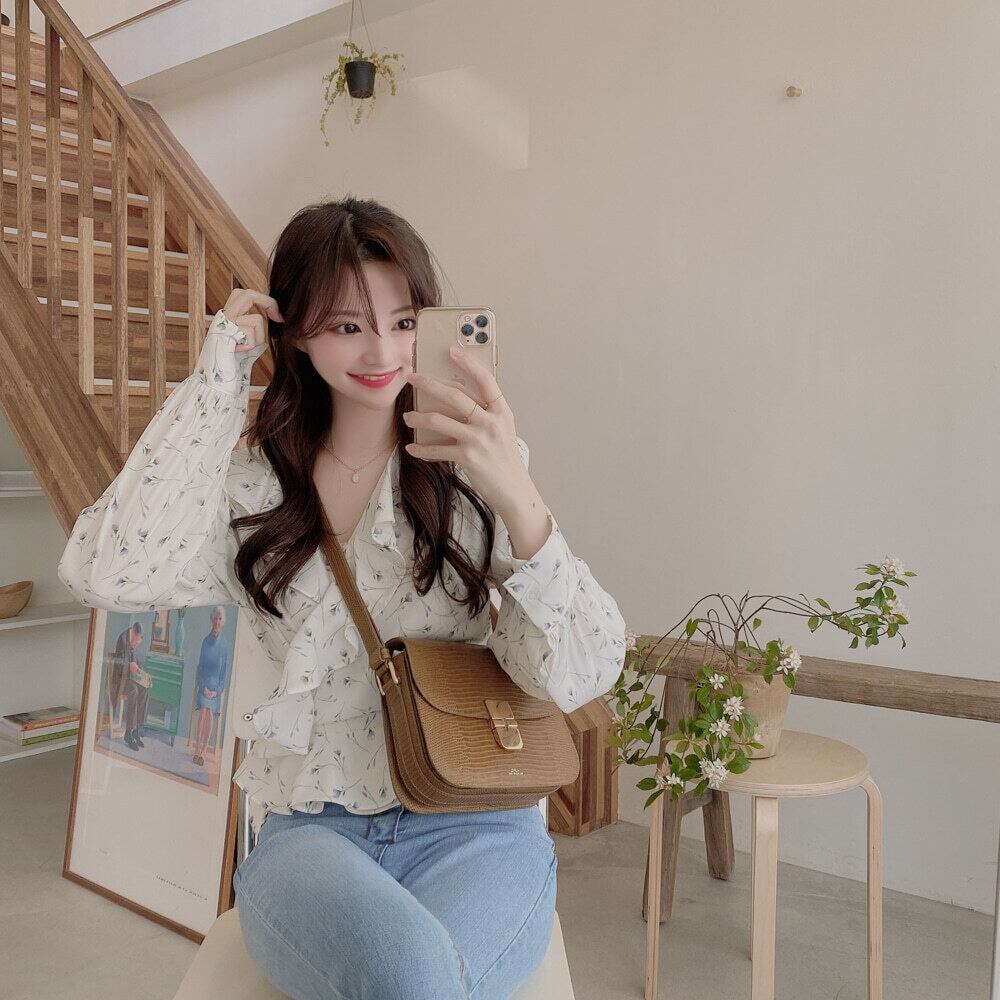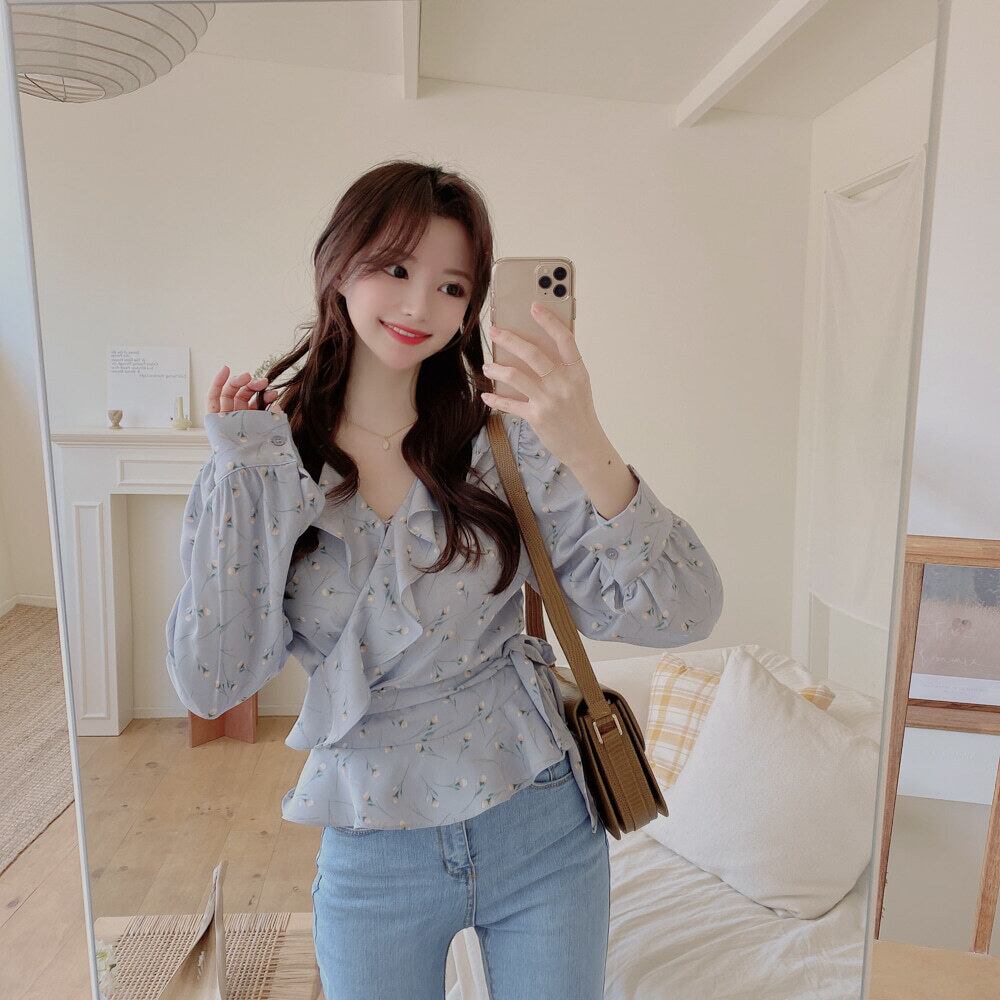 トップス ブラウス 袖あり 長袖 Vネック フレア シフォン フリル かわいい 大人可愛い きれいめ 大人 上品 おしゃれ お洒落 レトロ 大人可愛い 大人女子 キュート ガーリー 柄 花柄 小花柄 フラワー 春 夏 10代 20代 30代 レディース OL 学生 デート お出かけ 女子会 お泊まり 休日 リゾート 旅行 海 プール 韓国 韓国系 オルチャン モテ サイズ S M L 色展開 白 ホワイト 青 ブルー
