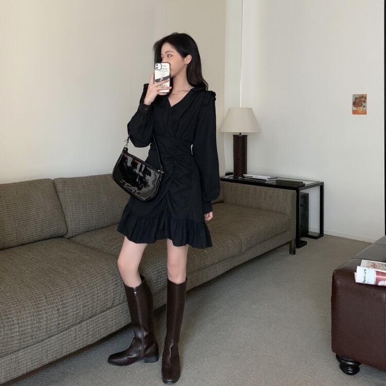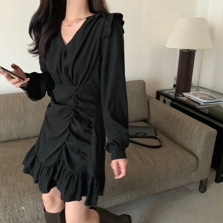 ワンピース シフォンワンピース ミニ 膝上 袖あり 長袖 パフスリーブ Vネック プリーツ シフォン フリル かわいい 大人可愛い おしゃれ キュート 無地 春 秋 10代 20代 レディース 通勤 デート お出かけ 女子会 休日 韓国系 ファッション コーデ スタイル 体系カバー 美脚 M L XL 2XL 3XL 4XL 大きいサイズ ブラック