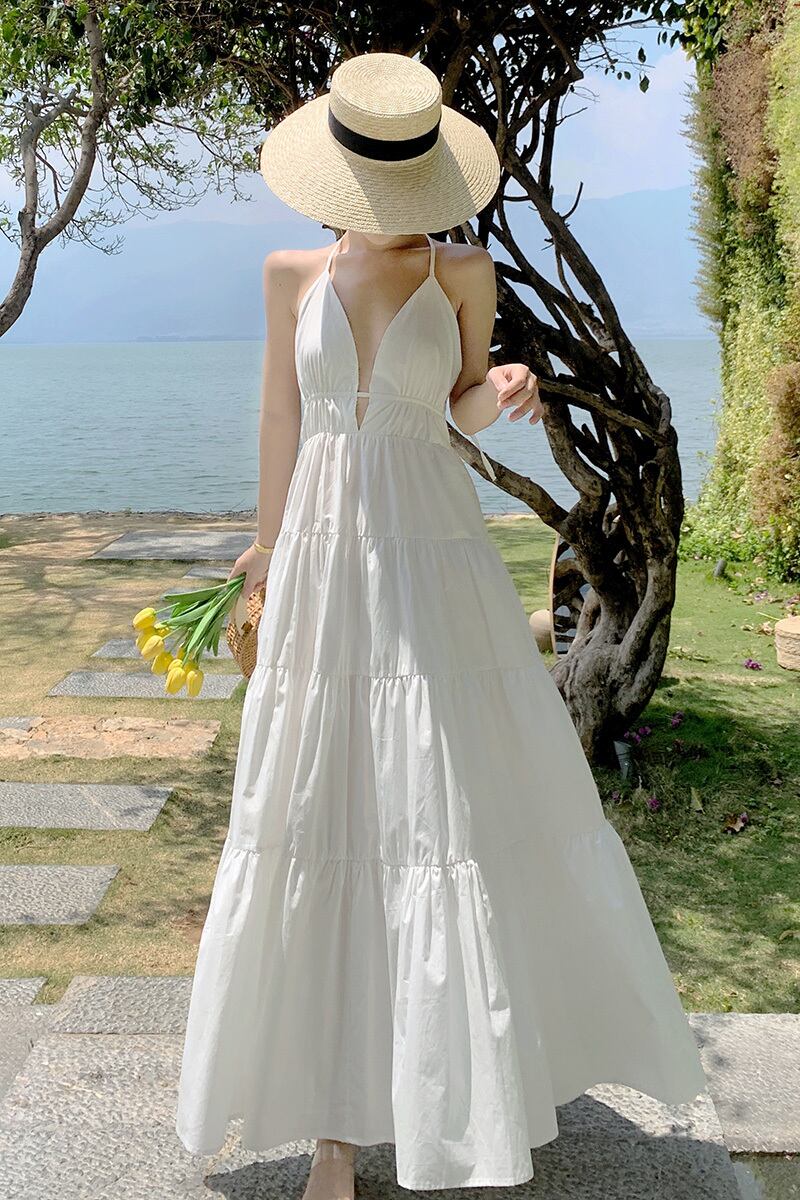 ワンピドレス ティアードワンピース マキシ丈 袖なし ホルターネック フレア 背中開き 大人可愛い きれいめ 上品 おしゃれ セクシー エレガント 着映え 無地 夏 レディース パーティー イベント リゾート 海 プール モテ 美脚 脚長 インスタ映え S M L ホワイト