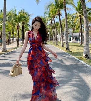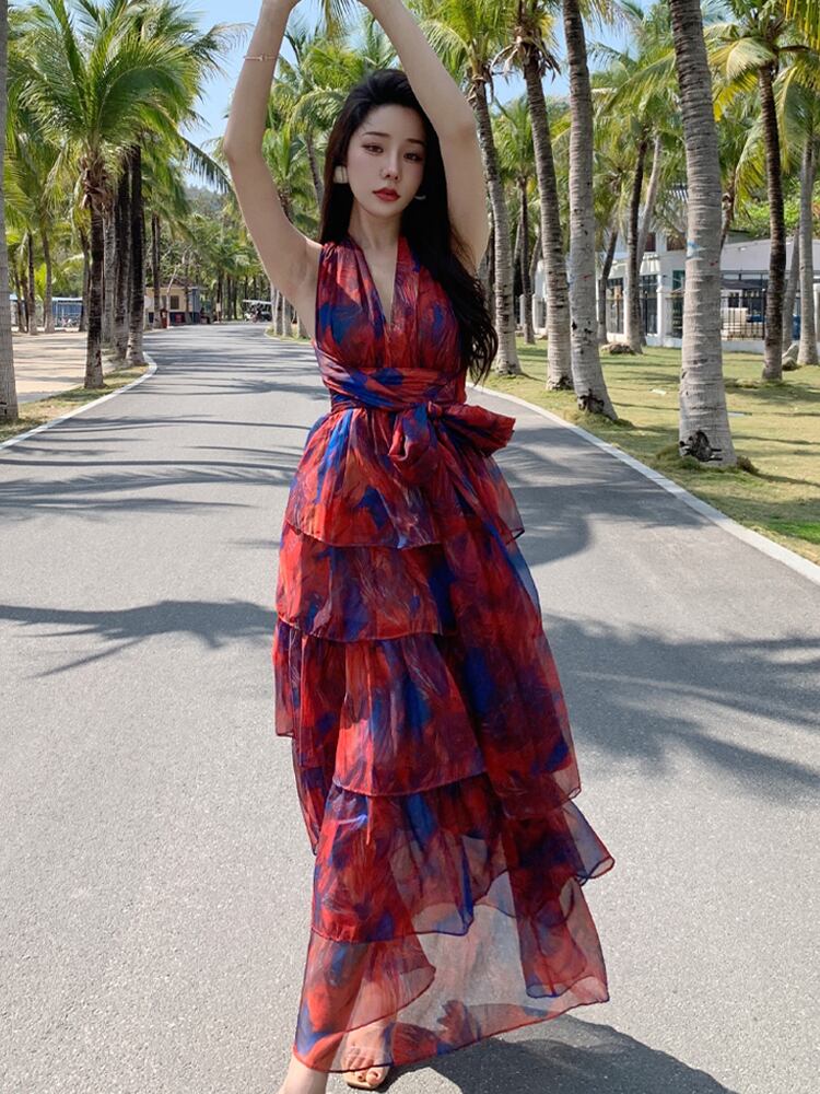 ワンピース ワンピドレス マキシ丈 袖なし ノースリーブ フレア 細身 背中開き クロスバック シフォン ハイウエスト 透け感 きれいめ 大人 おしゃれ セクシー エレガント 主役級 存在感 着映え ゴージャス 柄 プリント 夏 レディース パーティー イベント リゾート インスタ映え S M L 赤 レッド 青 ブルー