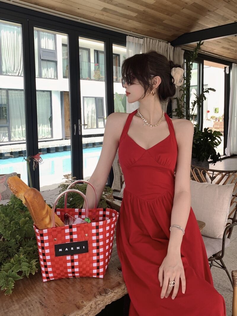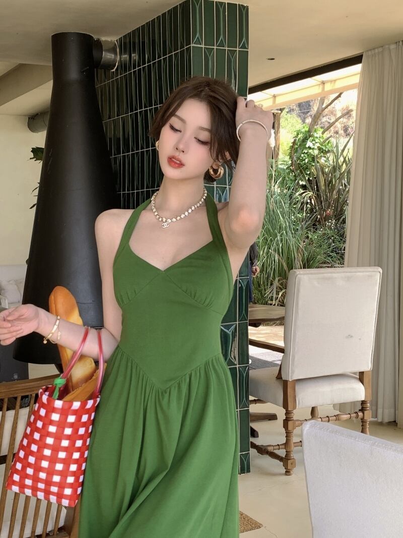 シンプルなデザインでありながら、大人可愛くきれいめな印象を与えるワンピースです。ホルターネックと袖なしのデザインで、清涼感のある夏の装いに最適です。フレアなシルエットが女性らしい印象を与え、ミモレ丈で足元をきれいに見せてくれます。流行の色である赤と緑の2色展開。おしゃれでエレガントな装いで、デートやイベント、リゾート、旅行などにもおすすめです。
