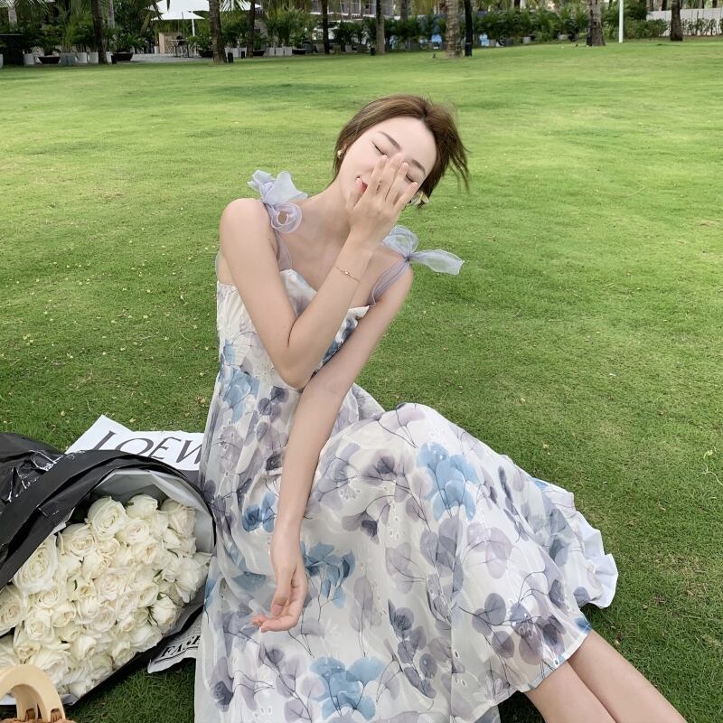 ワンピース ロング マキシ丈 袖なし ストラップ フレア 背中開き 刺繍 シフォン リボン 大人可愛い きれいめ 上品 おしゃれ エレガント 抜け感 清楚 着映え 花柄 フラワー 夏 レディース デート お出かけ 休日 イベント リゾート 旅行 海 プール モテ インスタ映え S M L XL ホワイト 青 ブルー 大人カラー