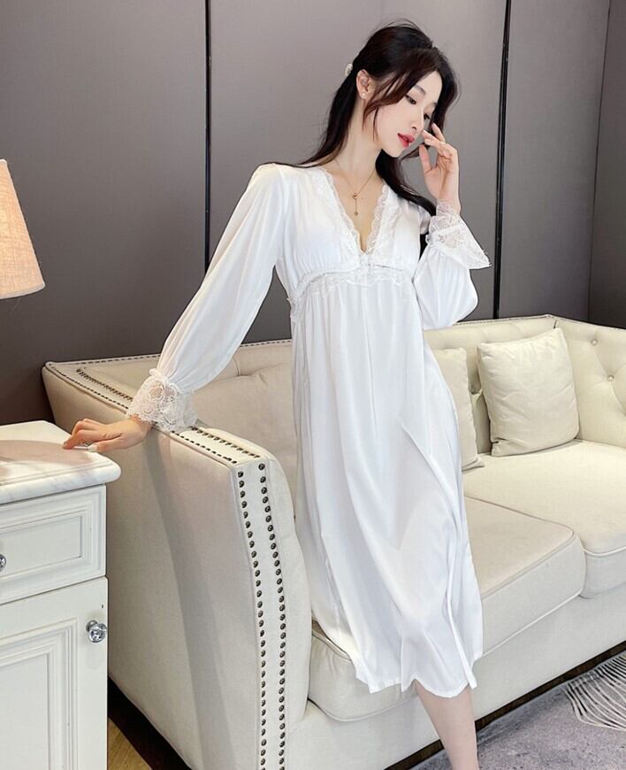 パジャマ 部屋着 寝巻き ナイトウェア ネグリジェ ミモレ ミモレ丈 袖あり 長袖 Vネック 襟なし Aライン レース ハイウエスト 胸パット かわいい 大人可愛い きれいめ 上品 おしゃれ お洒落 レトロ ラブリー キュート セクシー エレガント とろみ感 抜け感 無地 レディース 女性用 お泊まり ホテル 普段使い 楽ちん 美脚 脚長 M L XL 白 ホワイト 黒 ブラック 緑 グリーン ピンク ワインレッド キャラメル
