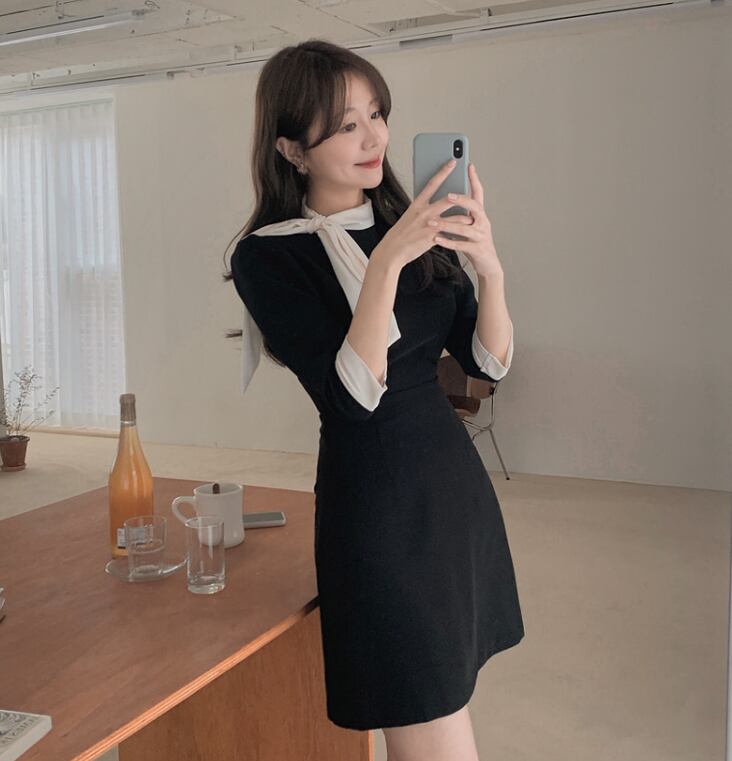 ワンピース ミニ ミニ丈 ショート ショート丈 袖あり 7分袖 Uネック スリム タイト シフォン リボン かわいい 大人可愛い きれいめ シンプル 大人 上品 おしゃれ お洒落 レトロ 大人可愛い 大人女子 無地 春 秋 冬 10代 20代 レディース OL 学生 デート お出かけ 公園デビュー 女子会 お泊まり 休日 韓国 韓国系 オルチャン モテ サイズ S M L XL 白 ホワイト 黒 ブラック