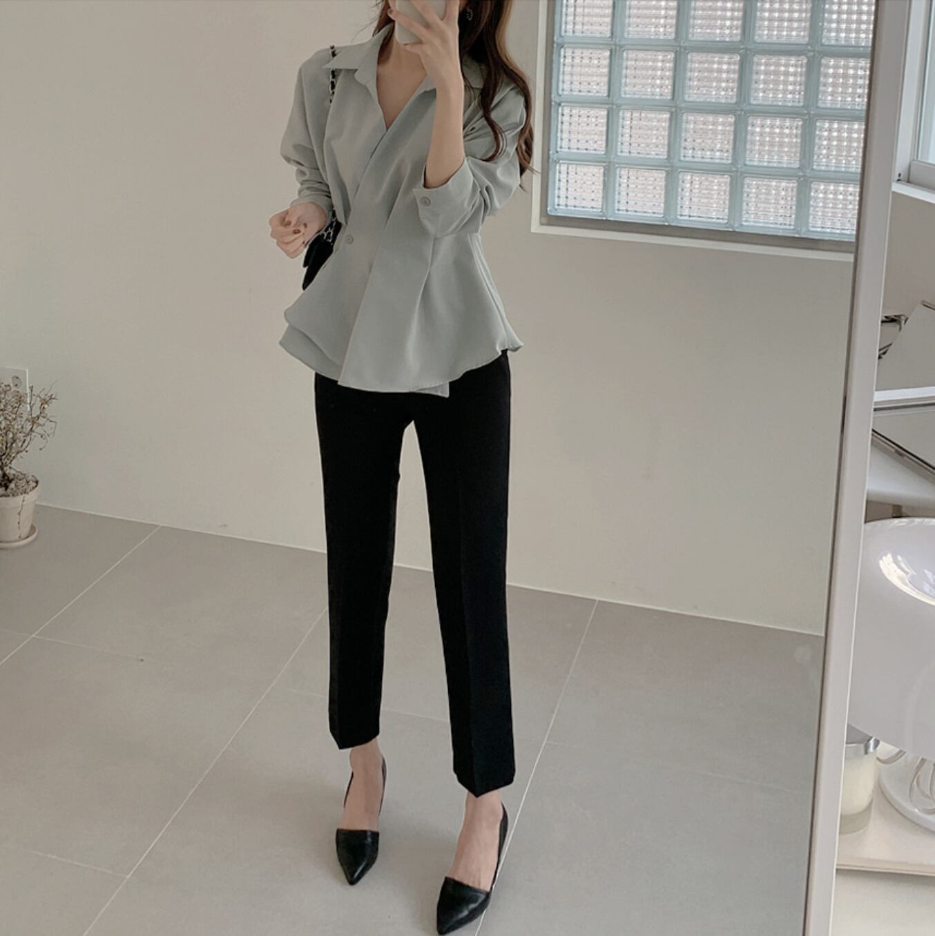トップス ブラウス 袖あり 長袖 カシュクール フレア ペプラム ウエストマーク 前開き 大人可愛い きれいめ シンプル 上品 おしゃれ こなれ感 エレガント とろみ感 清楚 無地 春 秋 レディース ビジネス OL 通勤 デート お出かけ 休日 普段使い モテ S M L XL 青 ブルー 灰色 グレー くすみカラー 大人カラー ライトブルー