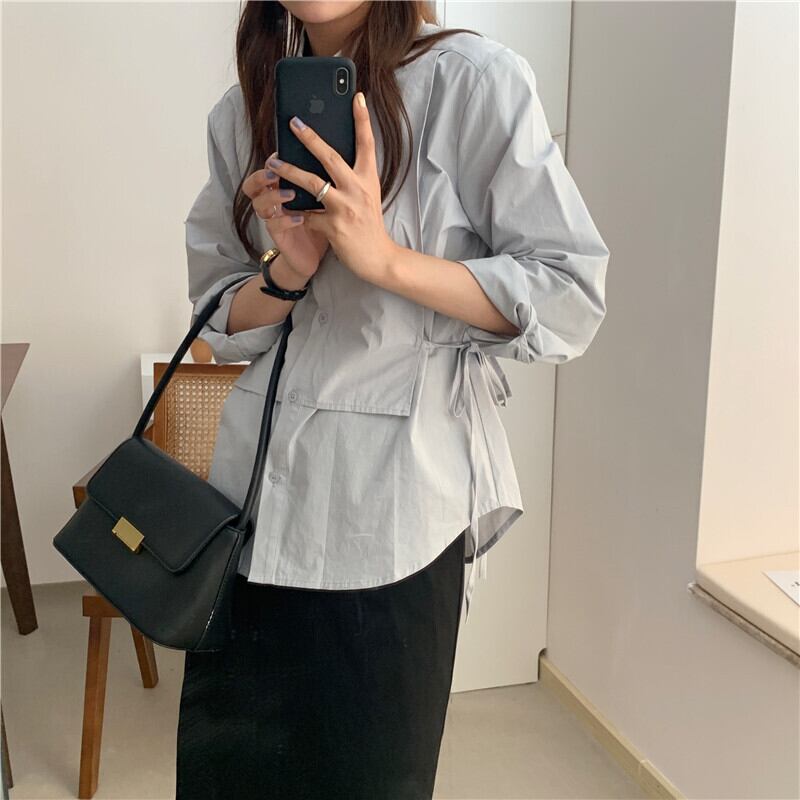 レイヤード風 トップス ブラウス 白トップス 袖あり 長袖 襟付き スリム 細身 スマート 前開き サイドリボン 大人可愛い きれいめ シンプル カジュアル 上品 おしゃれ 大人女子 こなれ感 エレガント 抜け感 清楚 着映え 無地 春 秋 レディース ビジネス OL 通勤 デート お出かけ 休日 着回し 普段使い 重ね着 トレンド 流行 S M L ホワイト ライトブルー