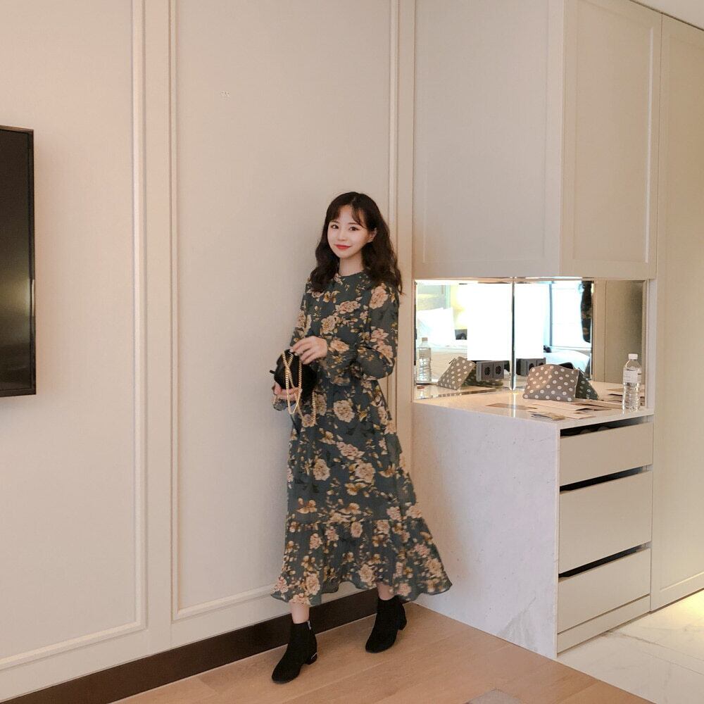 ワンピース 膝下 ミモレ ミモレ丈 袖あり 長袖 フレアスリーブ クルーネック フレア プリーツ シフォン ウエストマーク 透け感 かわいい 大人可愛い きれいめ 大人 上品 おしゃれ お洒落 大人可愛い 大人女子 主役級 存在感 柄 花柄 小花柄 フラワー 秋 冬 10代 20代 30代 レディース OL 学生 デート お出かけ 公園デビュー 女子会 お泊まり 休日 普段使い 韓国 韓国系 オルチャン モテ サイズ S M L XL 色展開 緑 グリーン