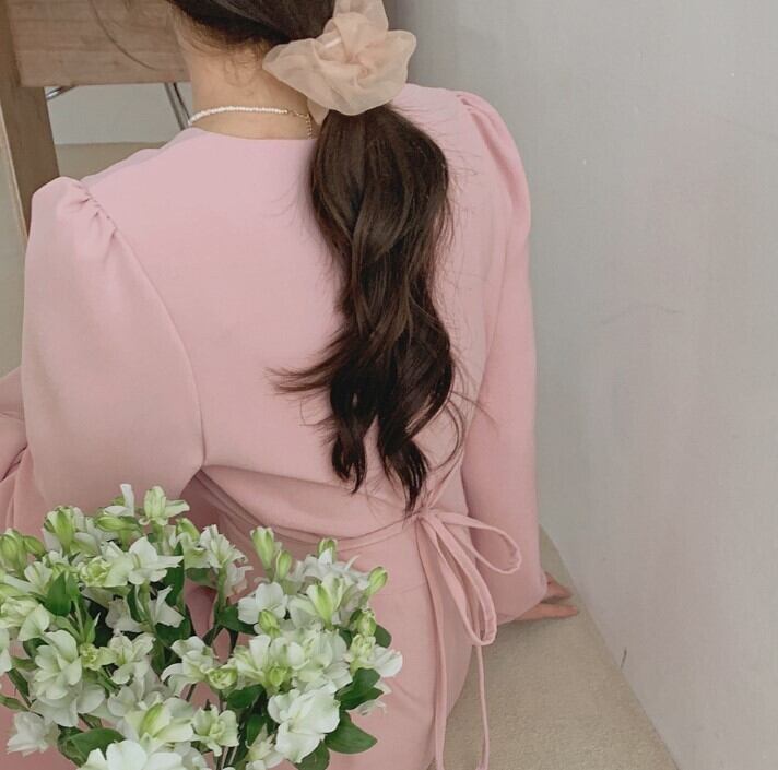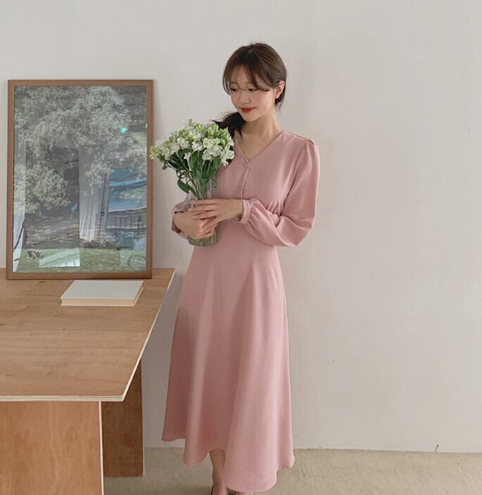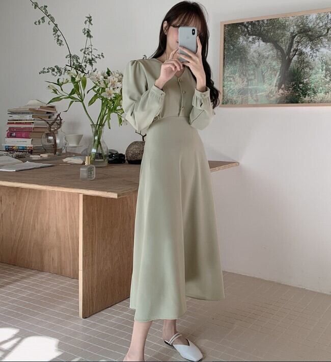 ワンピース ミモレ ミモレ丈 袖あり 長袖 パフスリーブ Vネック Aライン かわいい 大人可愛い きれいめ シンプル カジュアル 大人 おしゃれ レトロ 大人可愛い 大人女子 こなれ感 ラブリー キュート ガーリー とろみ感 無地 オールシーズン レディース ビジネス OL 通勤 学生 通学 デート お出かけ 女子会 休日 イベント リゾート 旅行 ガーデン レストラン 普段使い 韓国 ファッション モテ 脚長 S M L XL 緑 グリーン ピンク ネイビー アプリコット