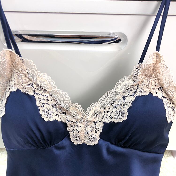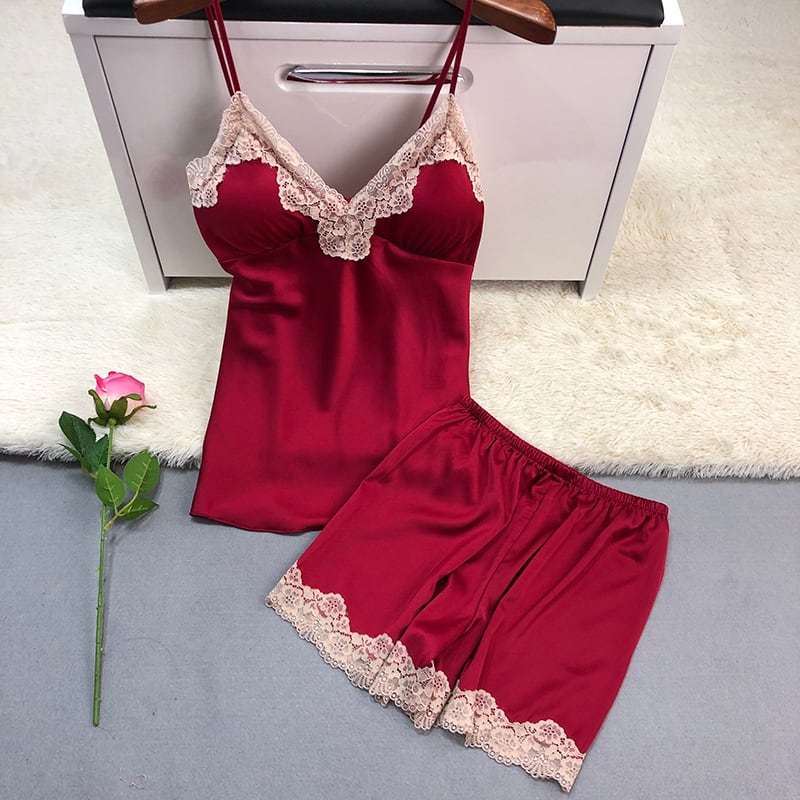 レースと光沢ある生地感がエレガントなランジェリーキャミソールとショートパンツのセットです。