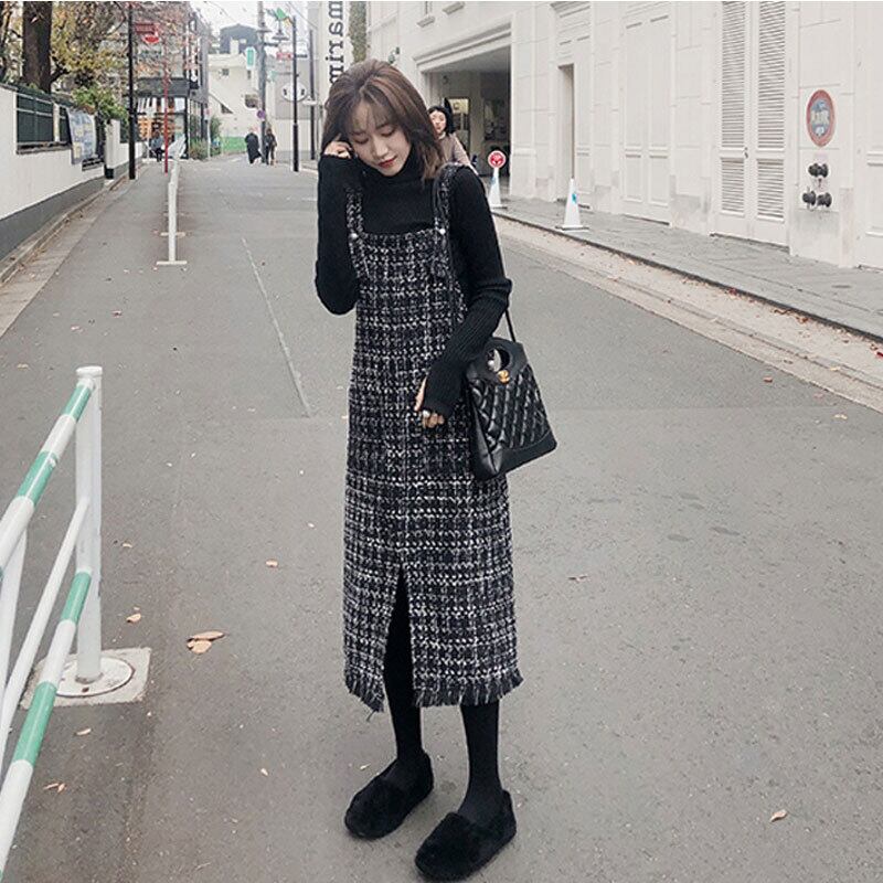 ツイード柄が上品なサスペンダースカートと、タートルネックのニットのセットです。
