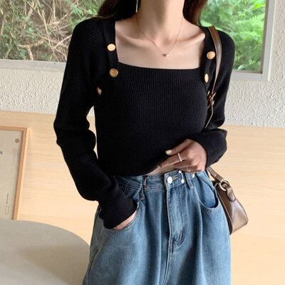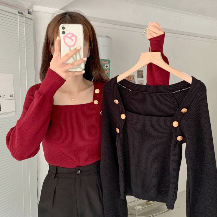トップス ニットソー セーター 袖あり 長袖 スクエアネック タイト 細身 ボタン 大人可愛い きれいめ シンプル 上品 おしゃれ エレガント 着映え 華奢 無地 秋 冬 レディース OL 通勤 デート お出かけ オフィス 着回し 普段使い 暖かい 防寒 モテ L XL 2XL 3XL 4XL 黒 ブラック 赤 レッド