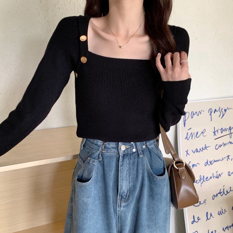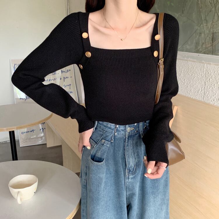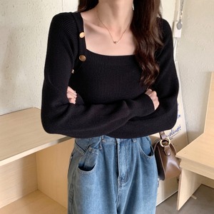 アクセサリーのようなボタンがポイントのニットトップスです。