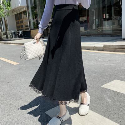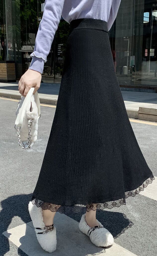 スカート ニットスカート ミモレ丈 ロング丈 Aライン レース ハイウエスト リブ ウエストゴム 伸縮性 大人可愛い きれいめ シンプル 大人 上品 おしゃれ エレガント 清楚 無地 春 秋 冬 レディース OL 通勤 デート お出かけ 休日 着回し 普段使い 体系カバー 美脚 脚長 S M L XL 黒 ブラック 灰色 グレー オフホワイト