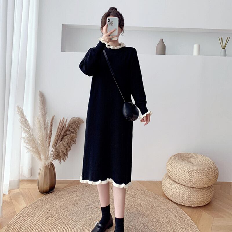 ワンピース ニットスカート ミモレ丈 ロング丈 袖あり 長袖 萌袖 ハイネック ストレート Iライン スマート フリル 伸縮性 かわいい 大人可愛い シンプル ガーリー 抜け感 無地 秋 冬 レディース デート お出かけ 普段使い 楽ちん 暖かい 防寒 モテ 体系カバー 美脚 脚長 L XL 2XL 3XL 4XL 黒 ブラック