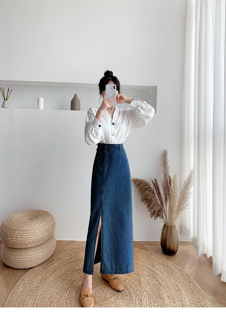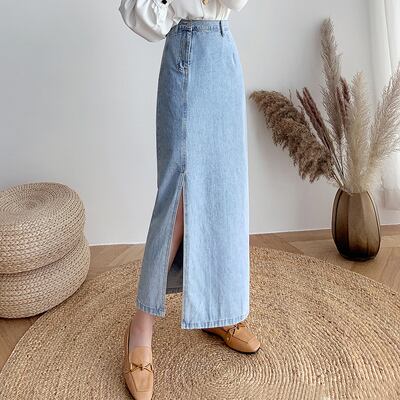 デニムスカート スカート マキシ丈 スリム ストレート Iライン サイドスリット きれいめ シンプル カジュアル 大人女子 こなれ感 ラフ エレガント 抜け感 着映え 無地 オールシーズン レディース お出かけ 休日 着回し 普段使い 体系カバー 美脚 脚長 S M L 青 ブルー ライトブルー