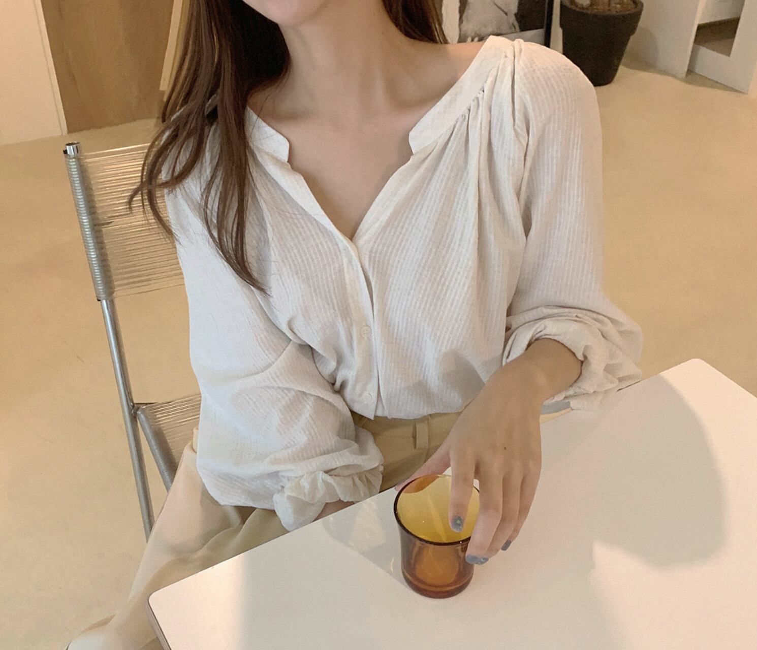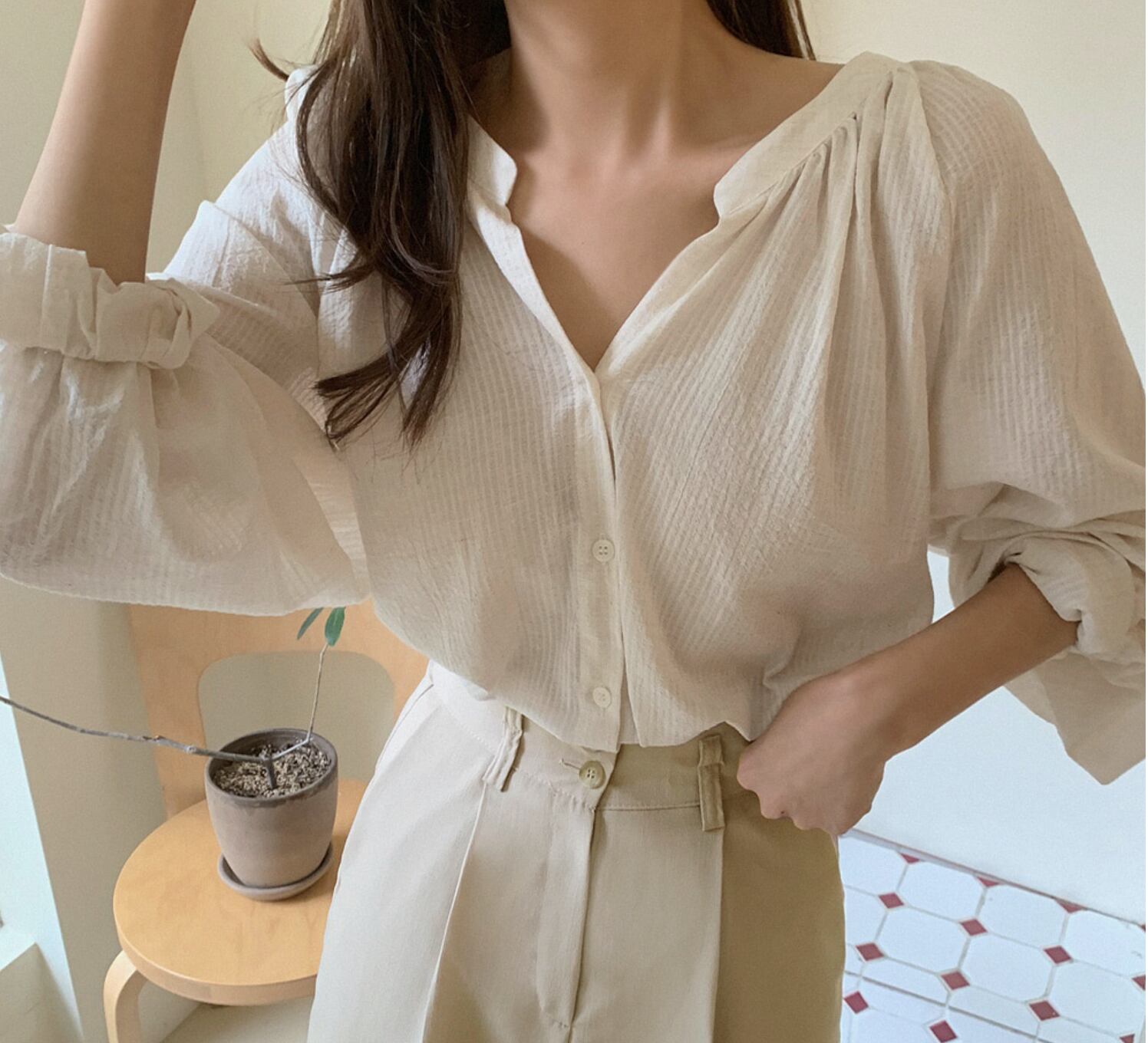 トップス ブラウス カットソー 袖あり 長袖 ボリューム袖 Vネック 前開き 透け感 大人可愛い カジュアル おしゃれ 大人女子 こなれ感 ルーズ 抜け感 無地 春 秋 レディース お出かけ 休日 着回し 普段使い 楽ちん フリーサイズ ゆったり ゆる ワンサイズ ホワイト