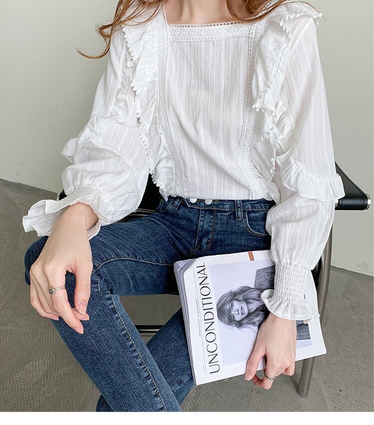 トップス ブラウス 白トップス 袖あり 長袖 ボリューム袖 パフスリーブ スクエアネック 刺繍 フリル ラッフル かわいい 大人可愛い シンプル カジュアル おしゃれ 大人女子 こなれ感 キュート ガーリー 着映え 春 秋 レディース 学生 通学 デート 女子会 休日 普段使い モテ S M L XL ホワイト