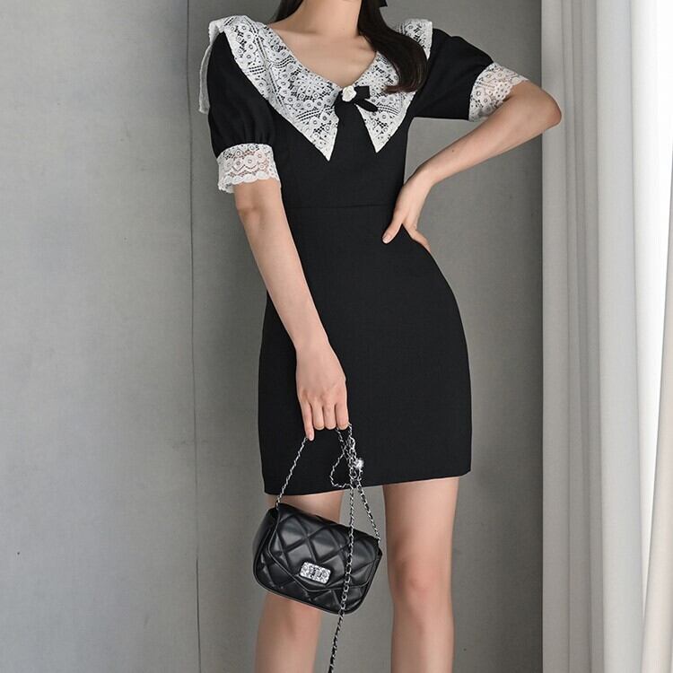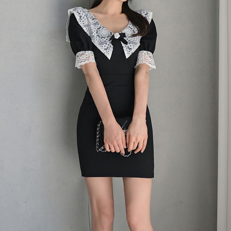ドレス ワンピース パーティドレス ビッグカラー ミニドレス タイトドレス ミニ ショート 膝上 袖あり 半袖 パフスリーブ ラウンドネック 襟付き Iライン スレンダー タイト スリム 細身 レース リボン ウエストマーク 大人可愛い おしゃれ かっこいい 大人女子 ラブリー クール セクシー エレガント 主役級 無地 10代 20代 レディース パーティー イベント ホテル スタイル 二の腕カバー 美脚 脚長 高見え 二次会 パーティー ラウンジ サイズ S M L XL ブラック