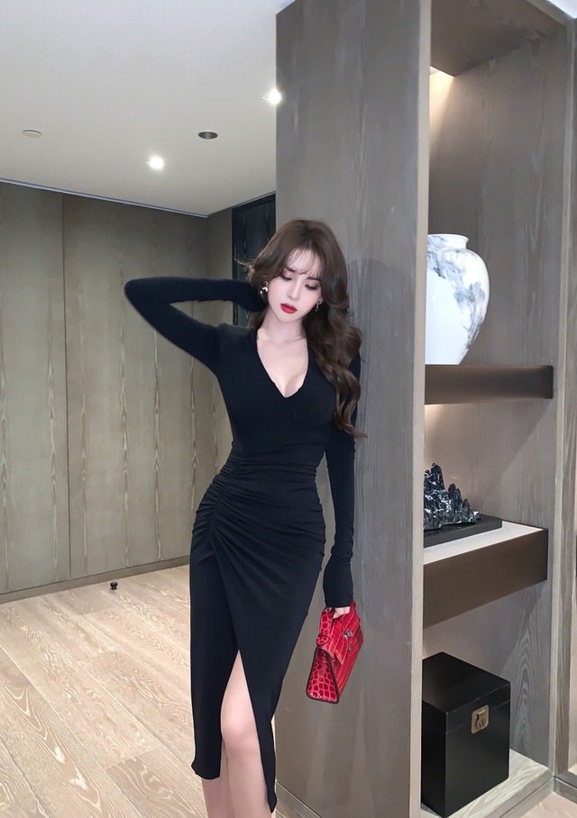 大きく開いたVネックや深めのスリットがセクシーなブラックワンピースです。
