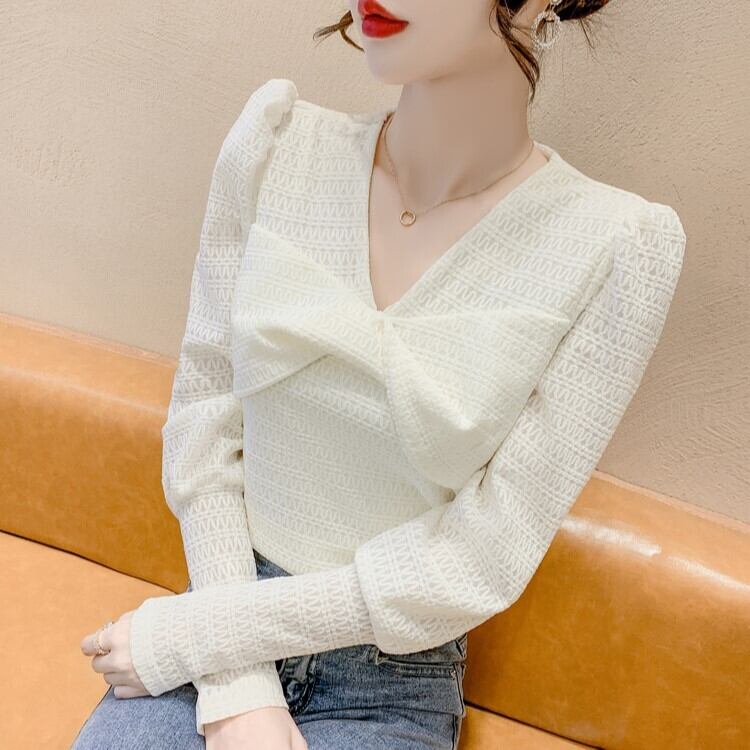 トップス レース カットソー プルオーバー 袖あり パフスリーブ 萌袖 Vネック スリム 細身 レース リボン 薄手 大人可愛い 上品 おしゃれ エレガント キュート 存在感 柄 春 秋 20代 レディース デート お出かけ 女子会 休日 ファッション コーデ スタイル モテ 体系カバー サイズ S M L XL アプリコット