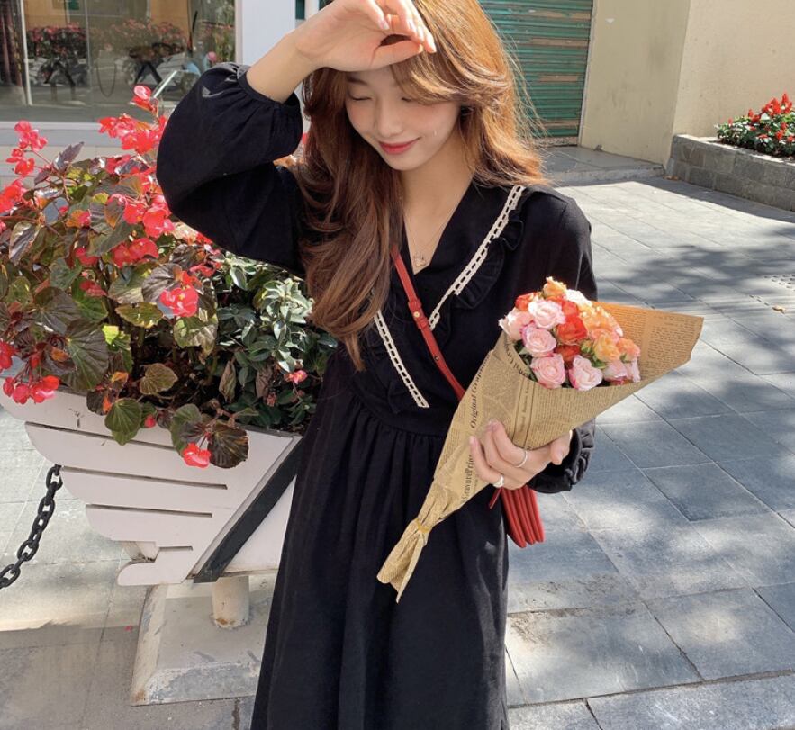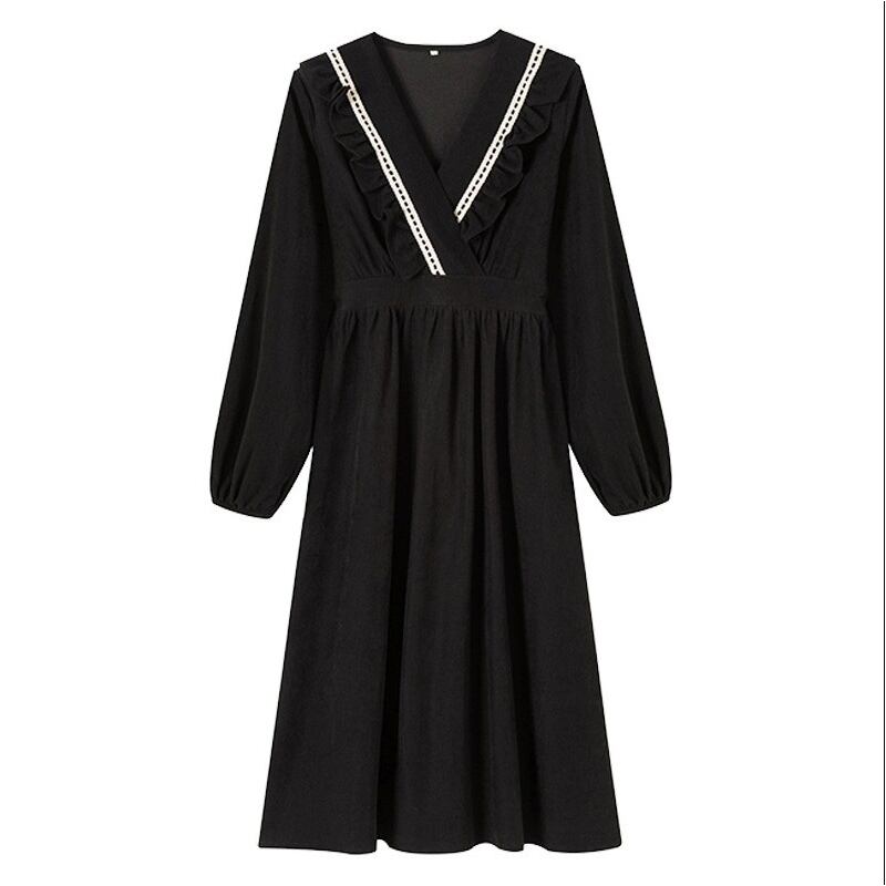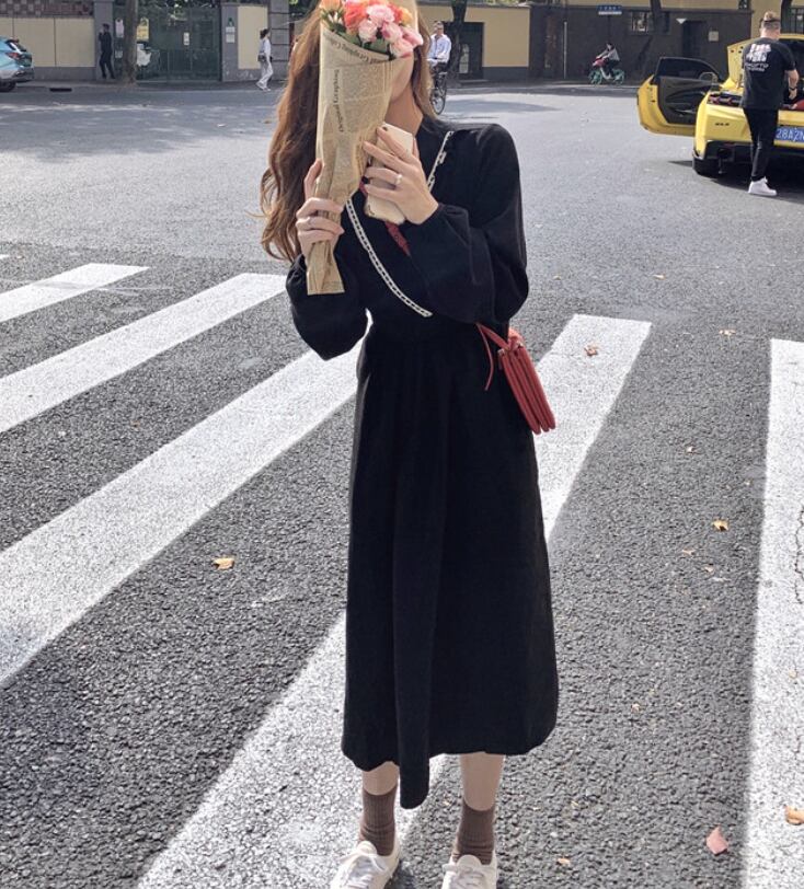 ワンピース ミモレ ミモレ丈 袖あり 長袖 パフスリーブ Vネック Aライン かわいい 大人可愛い きれいめ シンプル カジュアル 大人 上品 おしゃれ お洒落 かっこいい レトロ 大人可愛い 大人女子 こなれ感 クール モード系 セクシー 無地 秋 冬 レディース 学生 デート お出かけ 女子会 お泊まり 休日 旅行 普段使い 韓国 韓国系 オルチャン ファッション コーデ スタイル 楽ちん S M L XL 黒 ブラック