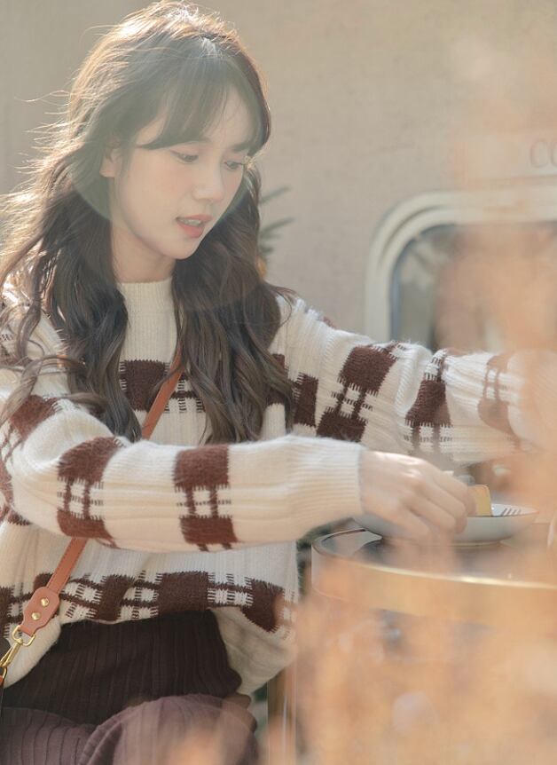 ホワイト×ブラウンの組み合わせが可愛らしさ満点の長袖ニットです。