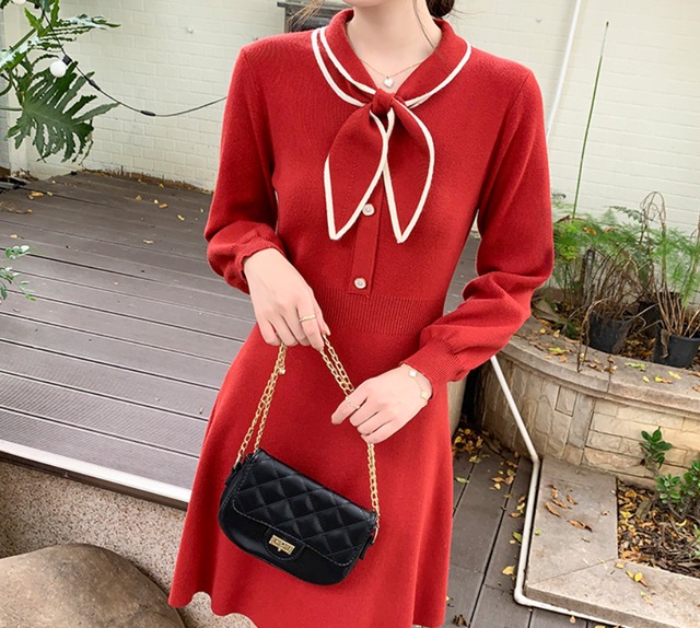 ワンピース ショート ショート丈 袖あり 長袖 襟付き セミフレア Aライン ポリエステル ニット かわいい 大人可愛い きれいめ シンプル カジュアル 大人 上品 おしゃれ お洒落 かっこいい レトロ 大人可愛い 大人女子 こなれ感 クール モード系 セクシー 無地 秋 冬 レディース デート お出かけ 女子会 休日 旅行 ホテル 韓国 韓国系 オルチャン ファッション コーデ スタイル モテ 美脚 脚長 フリーサイズ 黒 ブラック 赤 レッド 秋カラー アプリコット