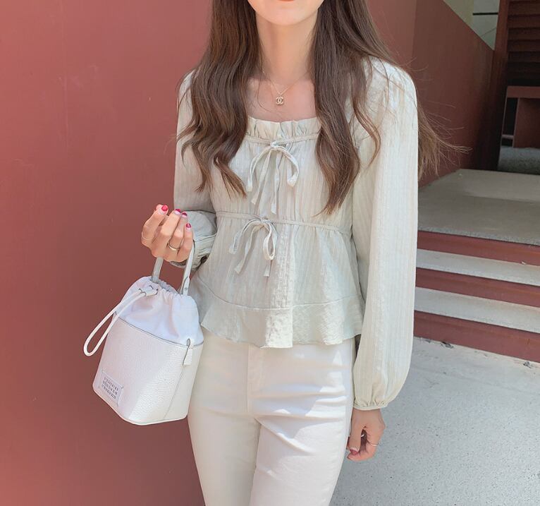 韓国版秋デザインの長袖スクエアネックシャツ。