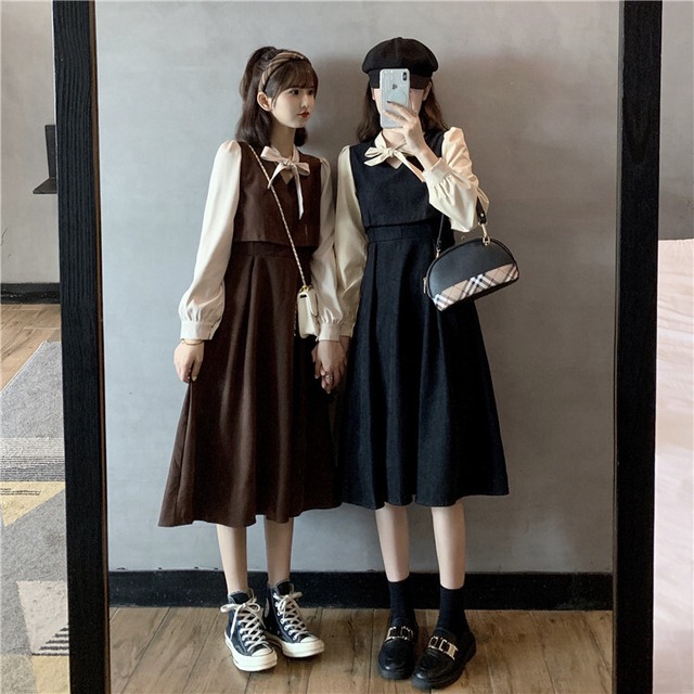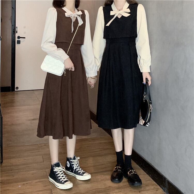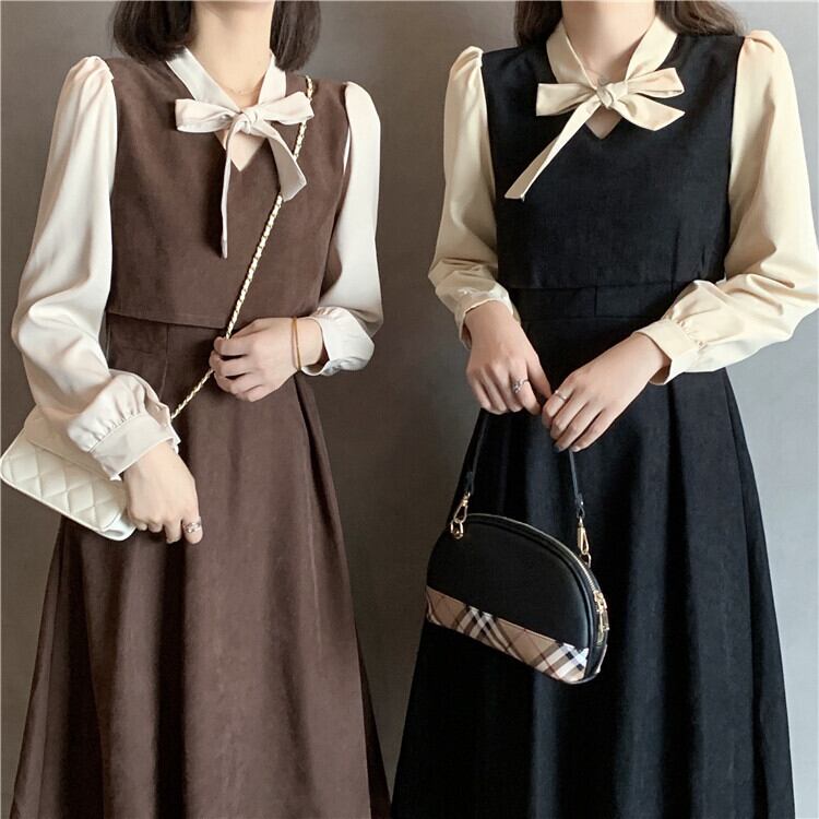 ワンピース フレアワンピース 膝丈 ひざ丈 袖あり 長袖 ボリューム袖 フレア セミフレア リボン ウエストマーク ツーピース 大人可愛い 上品 おしゃれ お洒落 レトロ ラブリー キュート ガーリー 春 秋 冬 2022 2023 10代 20代 レディース 女性用 キッズ 女の子 学生 デート お出かけ 休日 ファッション コーデ スタイル モテ M L XL 2XL 3XL 4XL 黒 ブラック 茶色 ブラウン