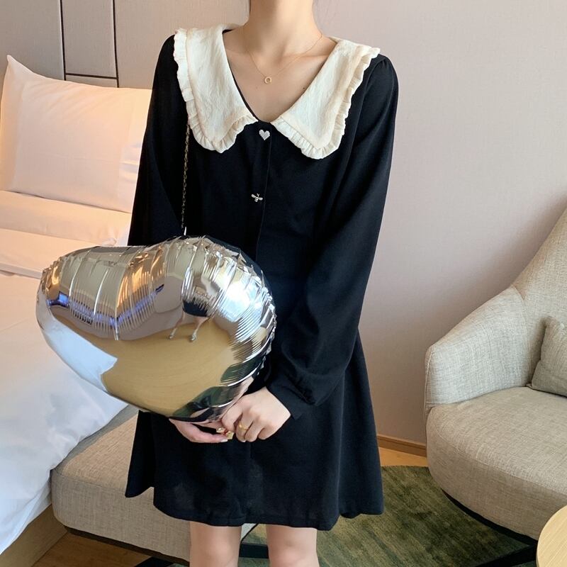 ハートのボタンやフリル付きの襟が可愛らしい印象のワンピースです。