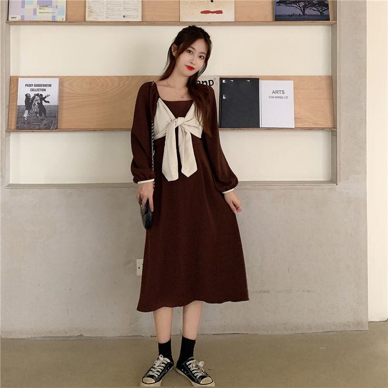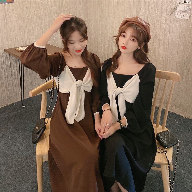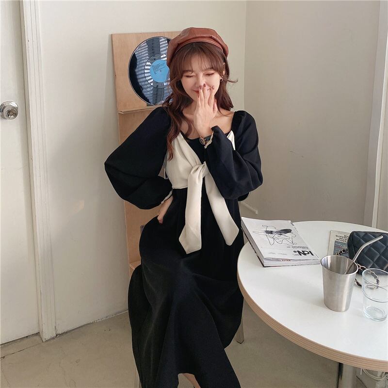 ワンピース フレアワンピース ミモレ ミモレ丈 袖あり 長袖 スクエアネック フレア セミフレア Aライン リボン 大人可愛い カジュアル おしゃれ お洒落 レトロ こなれ感 ラブリー キュート ガーリー 春 秋 冬 2022 2023 10代 20代 30代 レディース 女性用 キッズ 女の子 デート お出かけ 休日 ガーデン レストラン ファッション コーデ 楽ちん M L XL 2XL 3XL 4XL 黒 ブラック 茶色 ブラウン