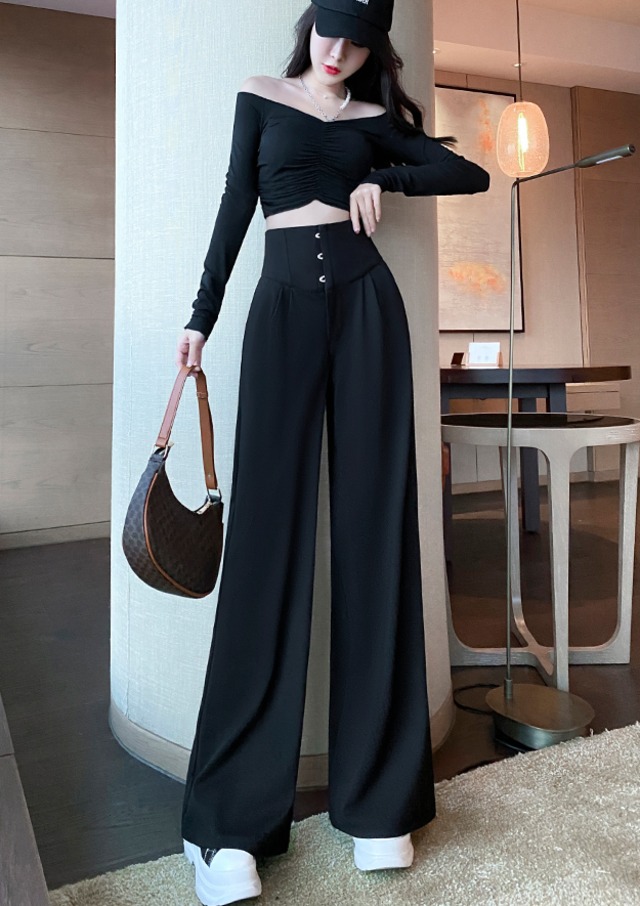 脚がスラっと綺麗に見えるハイウェストのワイドパンツです。