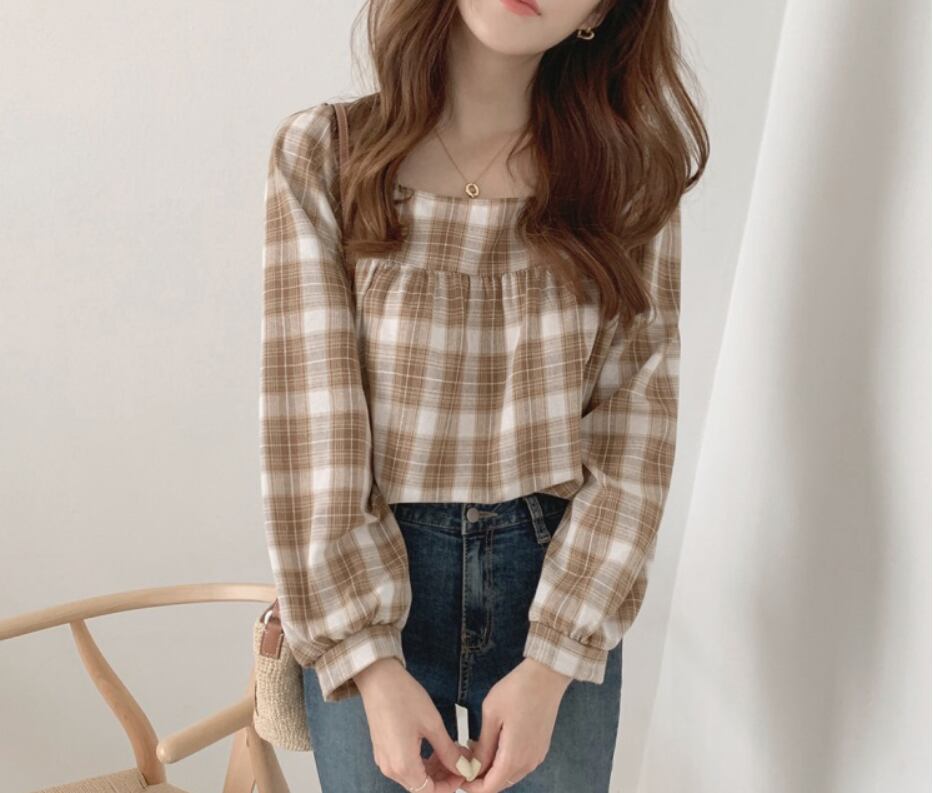 トップス シャツ 袖あり 長袖 スクエアネック 襟なし 薄手 かわいい 大人可愛い きれいめ おしゃれ お洒落 大人可愛い 大人女子 キュート ガーリー 柄 チェック柄 格子柄 春 秋 10代 20代 30代 女性用 通勤 学生 通学 デート お出かけ 女子会 お泊まり 休日 イベント 旅行 着回し 普段使い 重ね着 韓国系 ファッション コーデ スタイル モテ S M L XL 黒 黄色
