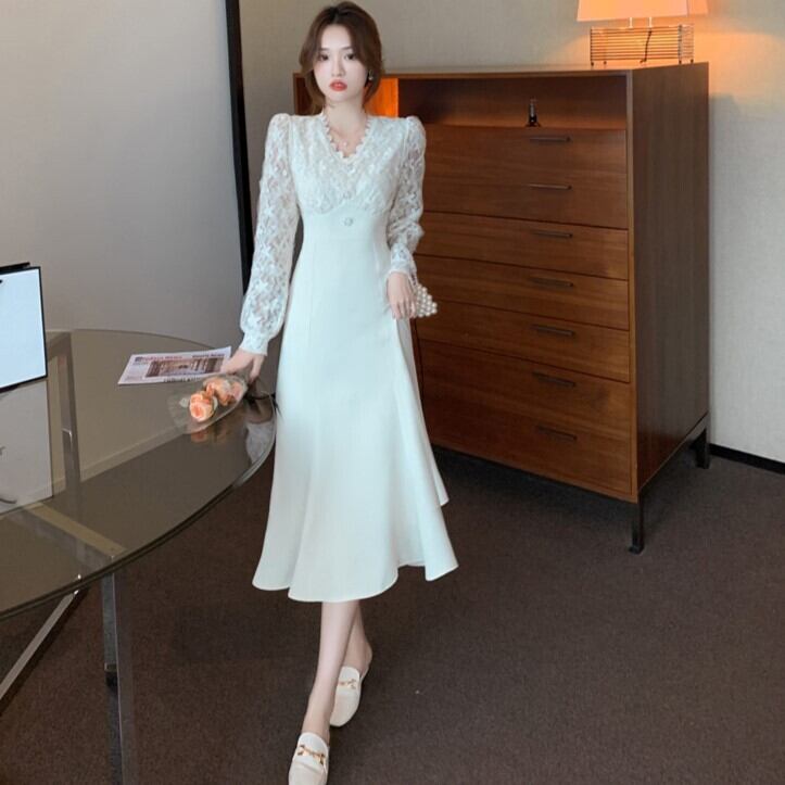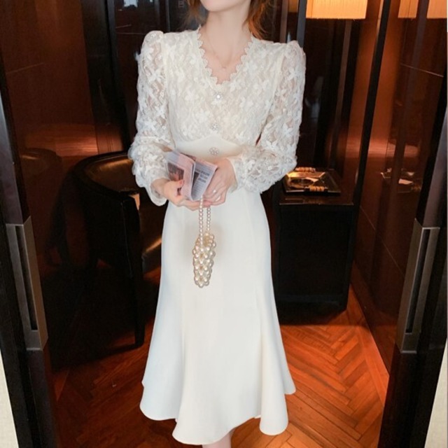 ドレス フィッシュテールドレス パーティードレス 膝下 ミモレ丈 パフスリーブ Vネック Aライン マーメイド ドッキング 細身 レース 刺繍 ウエストマーク 切り替えデザイン ハイウエスト 大人可愛い きれいめ 大人 上品 おしゃれ レトロ キュート エレガント フォーマル 華やか お嬢様 清楚 無地 フラワー 20代 30代 レディース 女子会 デート パーティー イベント ホテル レストラン スタイル 脚長 高見え 春 秋 二次会 お呼ばれ 入学式 入園式 サイズ S M L XL アプリコット