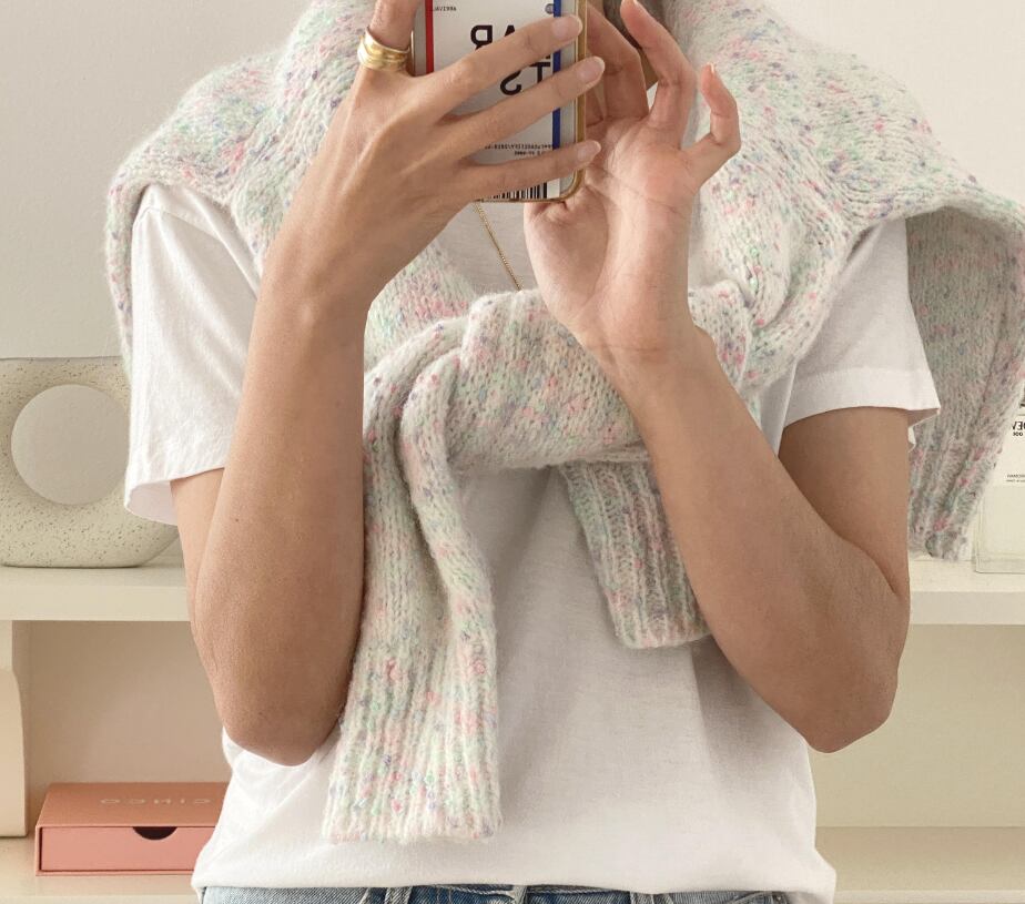 ミックスカラーのニットが淡くふんわりな雰囲気でかわいい。大人女子にぴったりの、カジュアルな着こなしをさりげなくエレガントにアップグレードできます。